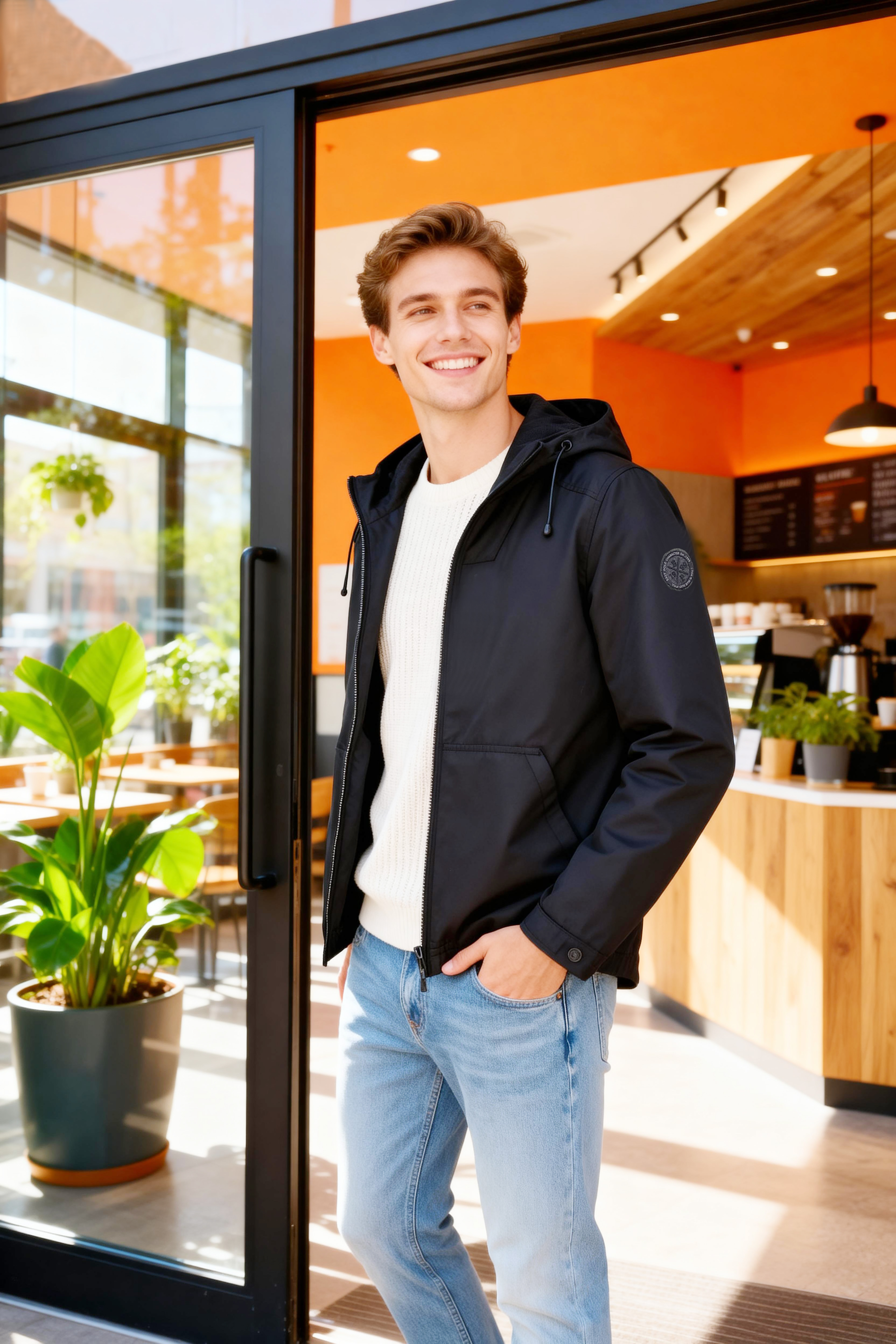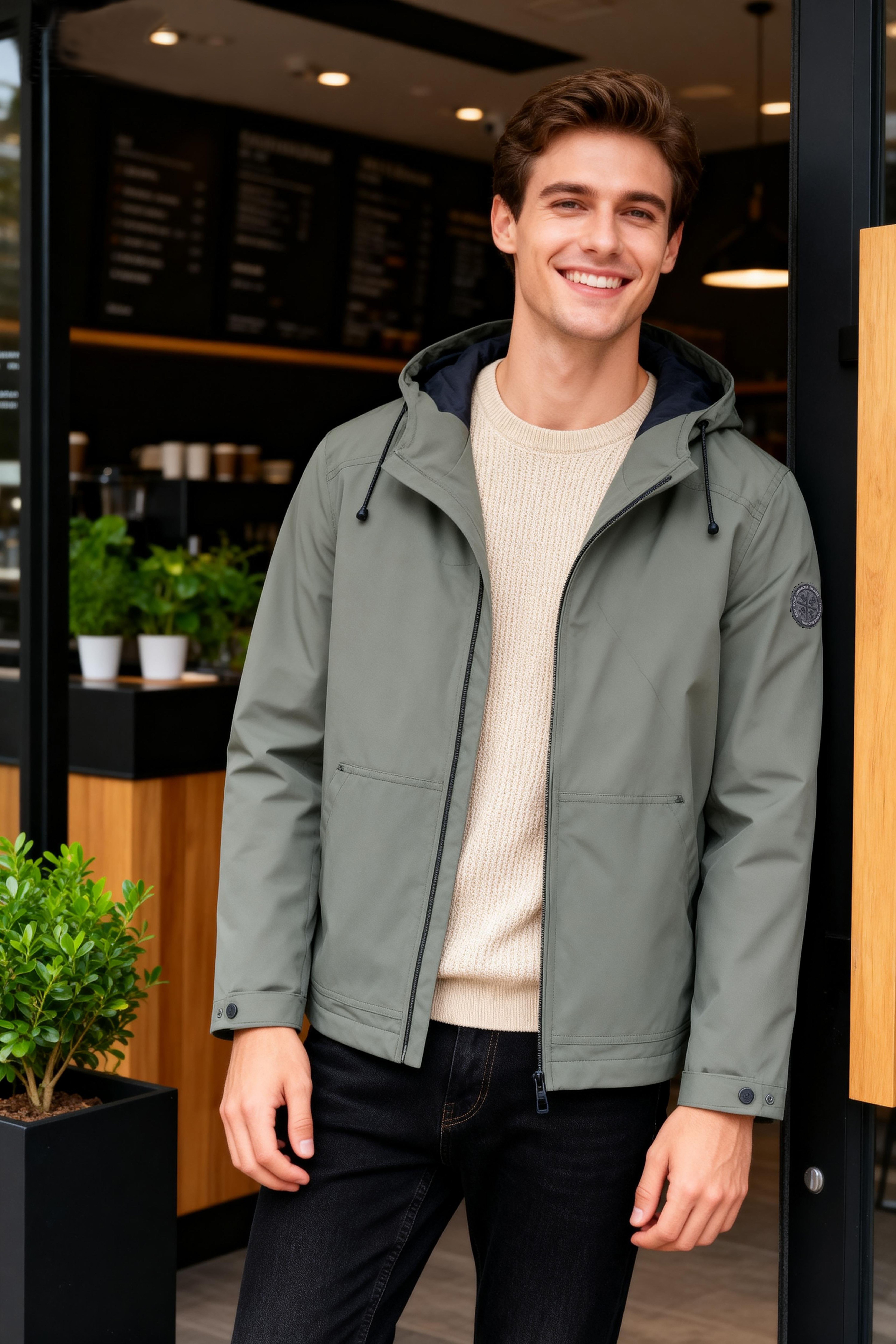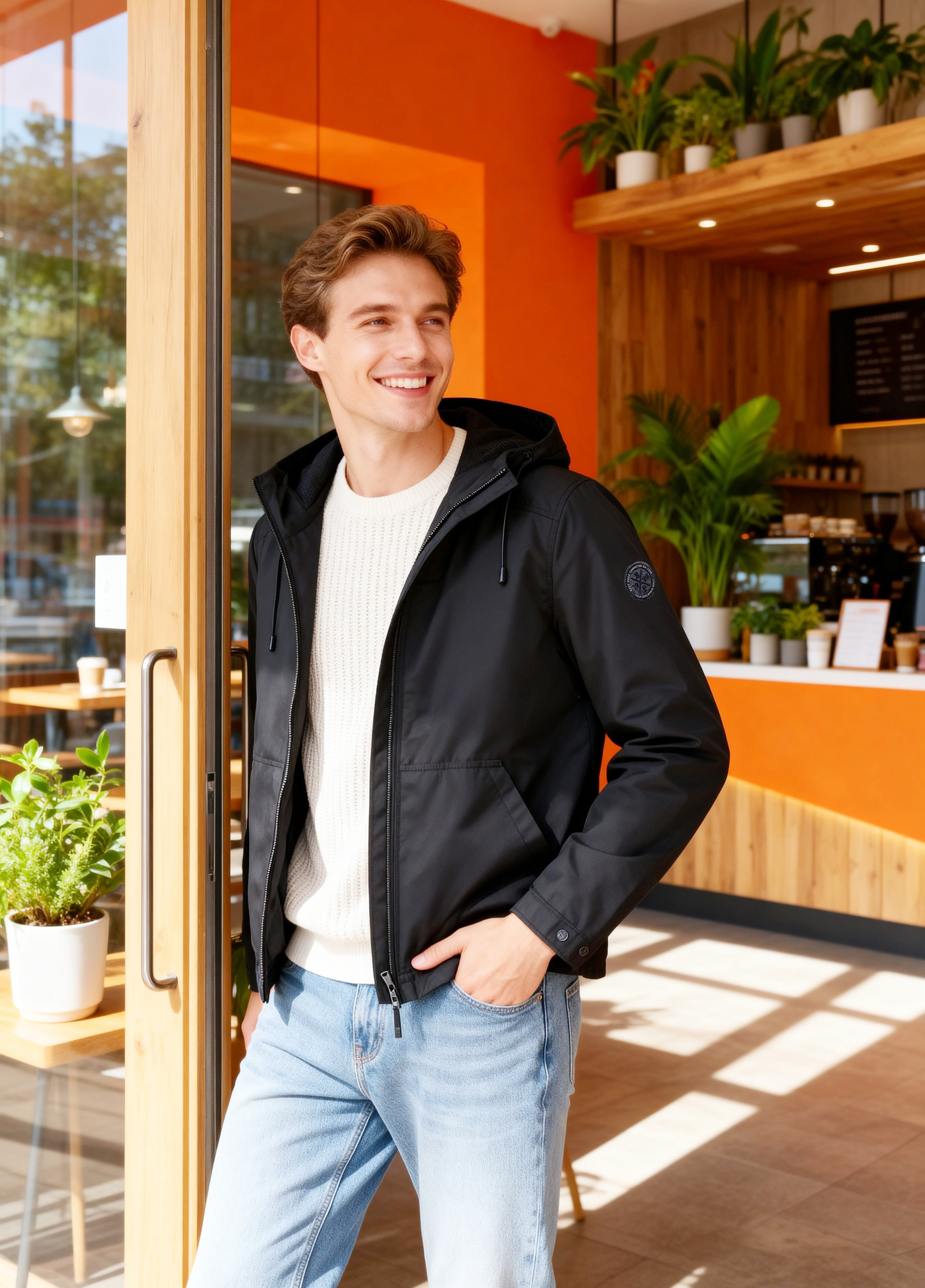 - 可調節抽繩連帽,貼合頸部